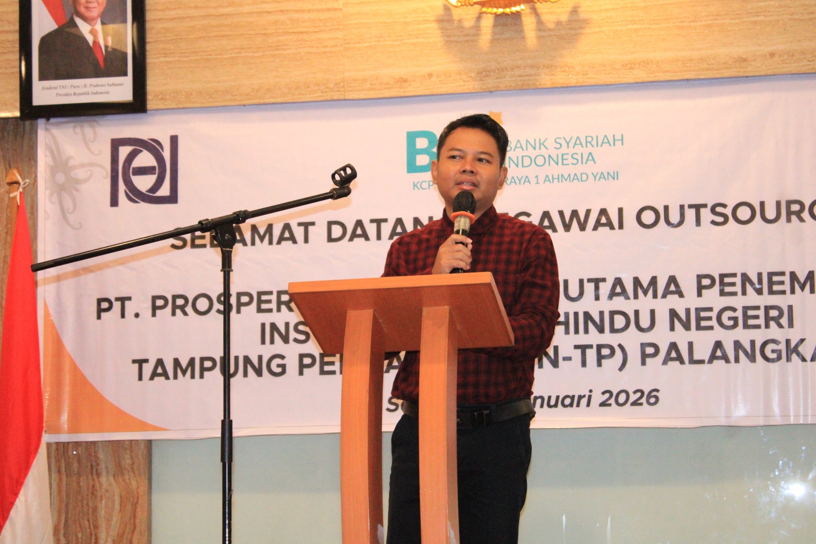 Rektor Institut Agama Hindu Negeri Tampung Penyang (IAHN-TP) Palangka Raya bersama Wakil Rektor Bidang Administrasi Umum, Perencanaan, dan Keuangan, Kepala Bagian Umum dan Layanan Akademik, serta Kepala Subbagian Tata Usaha, Perlengkapan, dan Rumah Tangga menghadiri kegiatan pembukaan pembekalan pegawai baru outsourcing di lingkungan IAHN-TP. Kegiatan ini berlangsung di Aula Imperial Aquarius Hotel Lantai III pada Sabtu (03/01).
