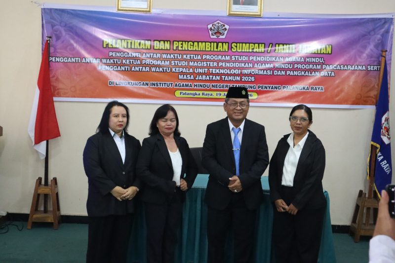 IAHNTPNews,- Institut Agama Hindu Negeri Tampung Penyang (IAHN-TP) Palangka Raya melaksanakan pelantikan dan pengambilan sumpah/janji jabatan Pengganti Antar Waktu Ketua Program Studi dan Kepala Unit Teknologi Informasi dan Pangkalan Data masa jabatan tahun 2026. Kegiatan ini berlangsung di Ruang Rapat Rektorat Lantai III pada Senin (19/01). Adapun pejabat yang dilantik yaitu Dr. Lilik, S.Ag., M.Pd.H...Read More