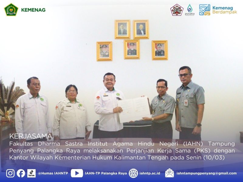 Fakultas Dharma Sastra Institut Agama Hindu Negeri (IAHN) Tampung Penyang Palangka Raya melaksanakan Perjanjian Kerja Sama (PKS) dengan Kantor Wilayah Kementerian Hukum Kalimantan Tengah pada Senin (10/03). Kegiatan penandatanganan kerja sama ini dilakukan sebagai upaya memperkuat sinergi dalam bidang pendidikan, penelitian, serta pengembangan sumber daya manusia khususnya di bidang hukum. PKS tersebut ditandatangani langsung oleh...Read More