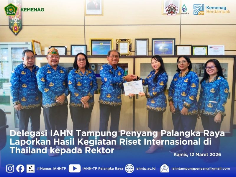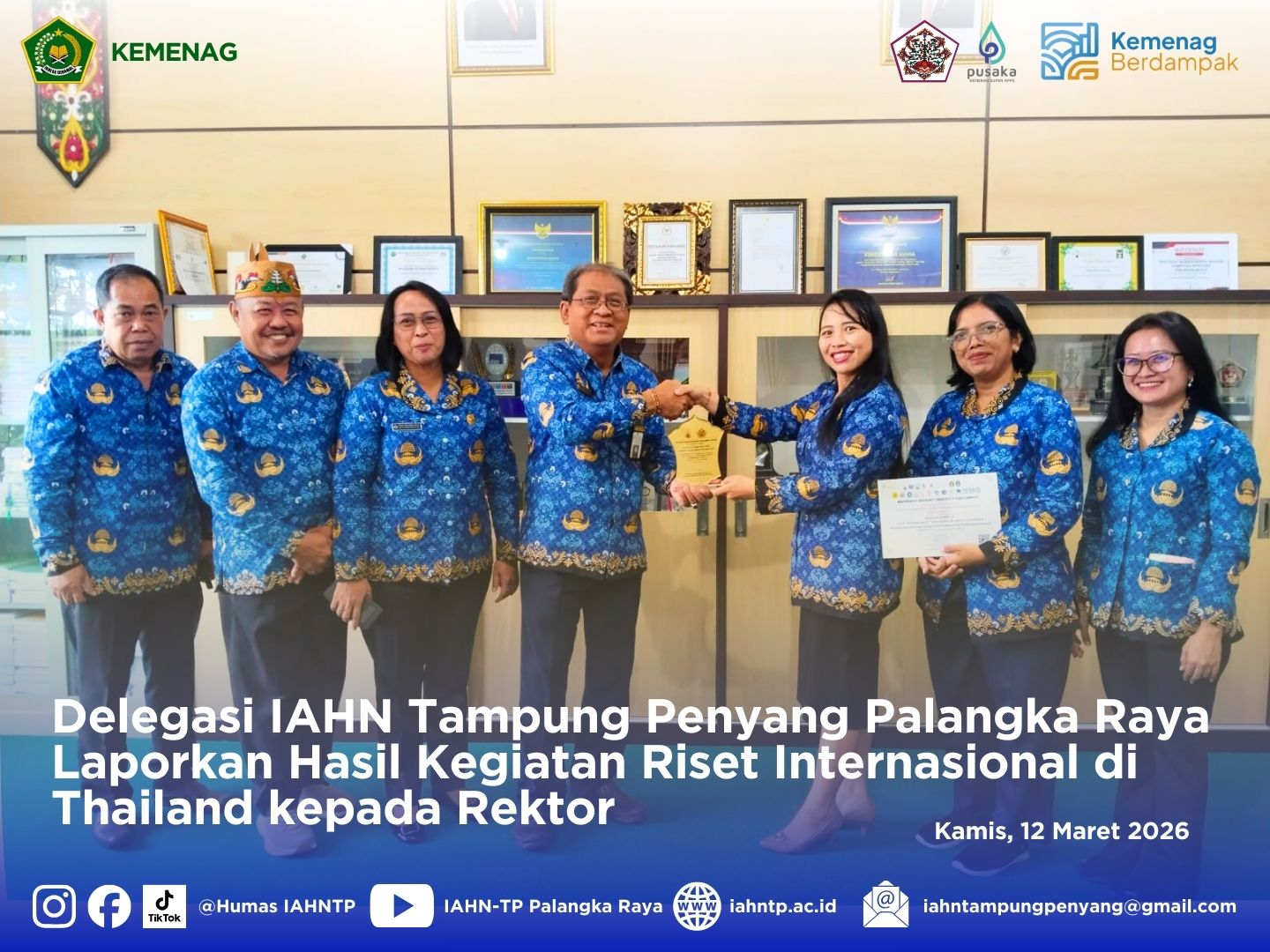 MENYALANews,- Delegasi dari Institut Agama Hindu Negeri (IAHN) Tampung Penyang Palangka Raya melaksanakan audiensi sekaligus pelaporan hasil kegiatan internasional kepada Rektor IAHN Tampung Penyang Palangka Raya, Dr. Mujiyono, S.Ag., M.Ag, di ruang Kerja Rektor. Kegiatan tersebut merupakan bentuk pertanggungjawaban akademik setelah mengikuti program Research and Academic Cooperation Development Project for Network Institution 2026 yang diselenggarakan oleh Mahamakut Buddhist University Isan Campus (MBU ISC), Thailand pada tanggal 4–10 Maret 2026.