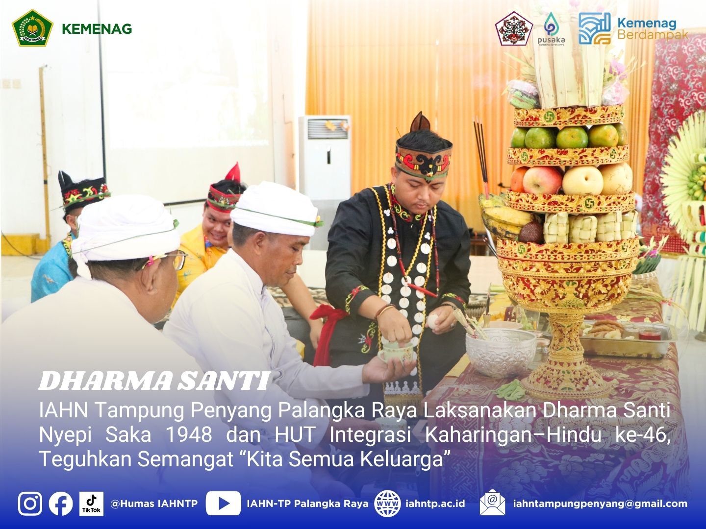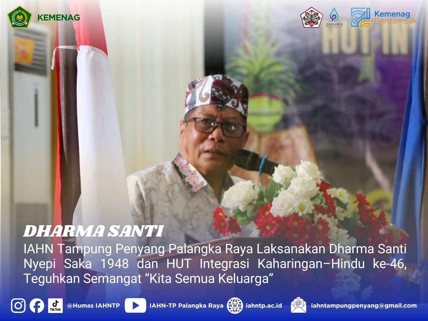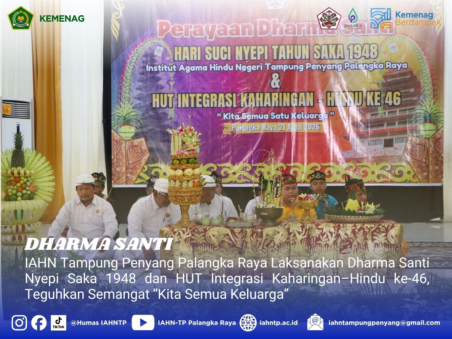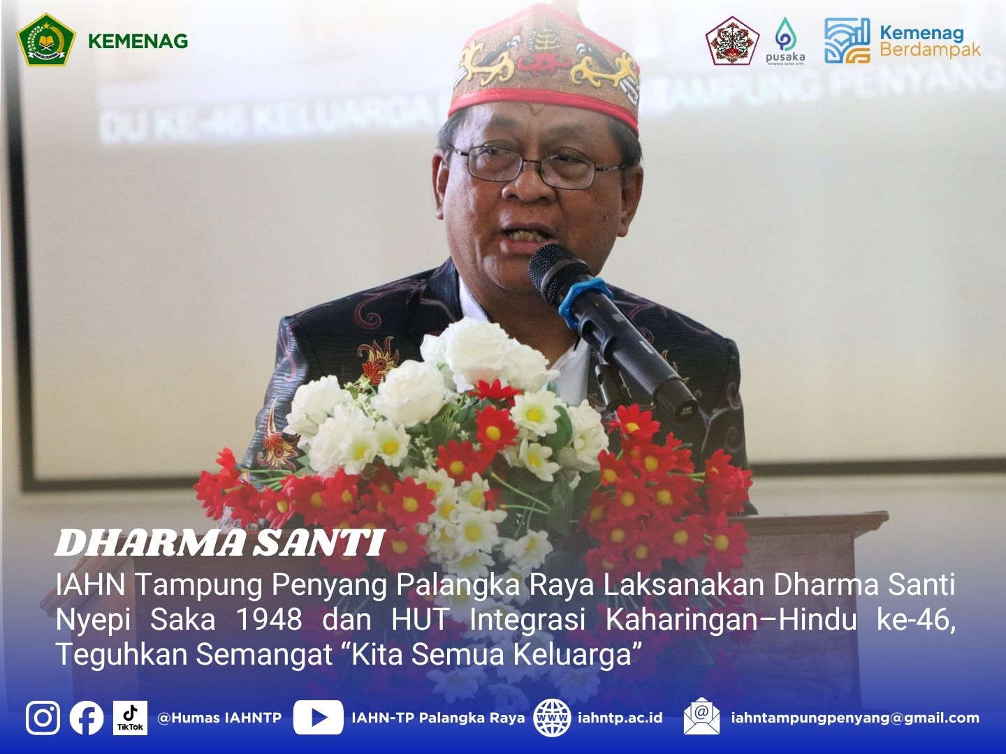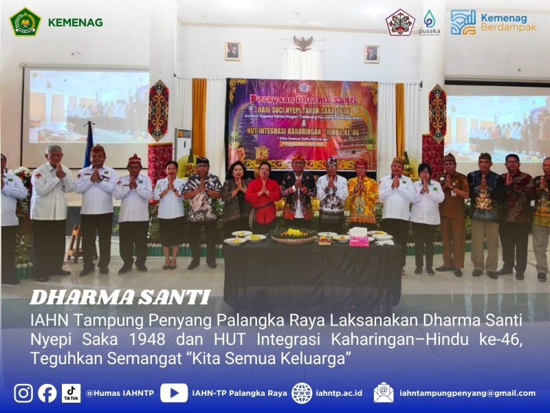 MENYALA,- IAHN Tampung Penyang Palangka Raya melaksanakan kegiatan Perayaan Dharma Santi Hari Suci Nyepi Tahun Saka 1948 sekaligus Perayaan Hari Ulang Tahun Integrasi Kaharingan–Hindu ke-46 dengan mengusung tema “Kita Semua Keluarga”. Kegiatan berlangsung khidmat di Aula Serbaguna kampus dan dihadiri berbagai unsur penting, di antaranya Rektor IAHN Tampung Penyang Palangka Raya beserta Unsur Pimpinan, Kabid Bimas Hindu Kalteng, Ketua MB-AHK Pusat Palangka Raya, Ketua PHDI Provinsi Kalteng, PHDI Kota Palangka Raya, Ketua WHDI Kalteng, Dharma Wanita Persatuan IAHN, Tokoh Umat Hindu Kaharingan, ASN dan Mahasiswa IAHN Tampung Penyang Palangka Raya.