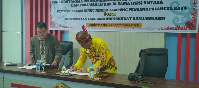IAHNTPnews,-  Institut Agama Hindu Negeri Tampung Penyang Palangka Raya (IAHN-TP) resmi menandatangani Nota Kesepahaman (MoU) dengan Universitas Lambung Mangkurat (ULM) Banjarmasin. Acara tersebut dilaksanakan di ruang seminar Gedung Pascasarjana ULM, dan dihadiri oleh sejumlah pejabat dari kedua institusi, Jumat (27/09). Rektor IAHN-TP menyampaikan terima kasih...