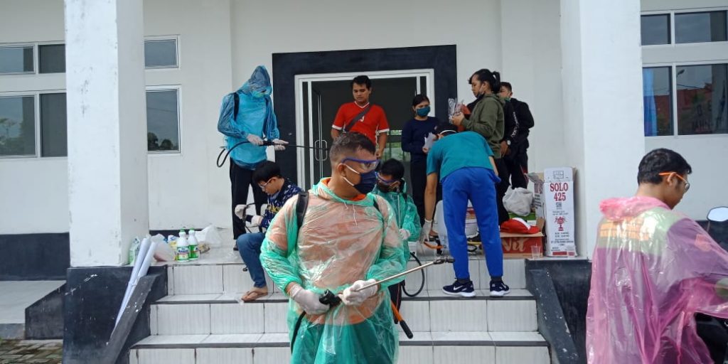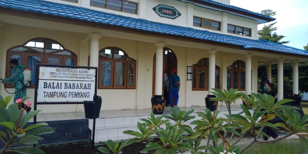 IAHN-TPnews, -Minggu (19/4/2020) Badan Eksekutif Mahasiswa (BEM) Institut Agama Hindu Negeri Tampung Penyang (IAHN-TP) Palangka Raya mengadakan kegiatan penyemprotan cairan desinfektan di beberapa titik khususnya fasilitas umum, tempat ibadah, dan pemukiman penduduk di sekitar kampus IAHN-TP Palangka Raya. Kegiatan ini dilaksanakan oleh 12 orang mahasiswa yang merupakan gabungan organisasi mahasiswa yaitu BEM IAHN-TP Palangka Raya bersama dengan Organisasi Kemahasiswaan (Orkemas) lainnya di IAHN-TP Palangka Raya dan dibantu oleh warga RT-05 di wilayah kampus.