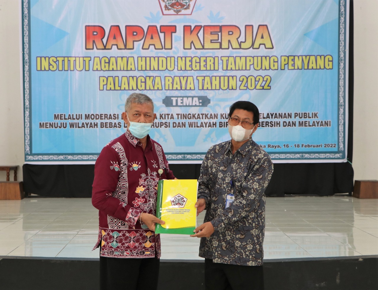 Penutupan kegiatan Rapat Kerja IAHN-TP Palangka Raya Tahun 2022 diakhiri dengan penyerahan hasil Rapat Kerja oleh Ketua Panitia kepada Rektor IAHN-TP Palangka Raya.//A.S//