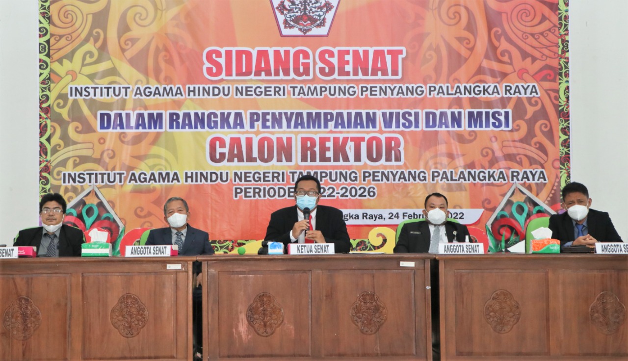 IAHNTPnews,- Dua Calon Rektor Institut Agama Hindu Negeri Tampung Penyang (IAHN TP) Palangka Raya periode 2022 – 2026, Dr Mujiyono, S Ag., M Ag dan Tiwi Etika, S Ag., M Ag., Ph. D menyampaikan visi misi dan program kerjanya pada Sidang Senat Terbuka IAHN TP Palangka Raya di Aula Serbaguna IAHN-TP Palangka Raya, Kamis (24/2/2022).
