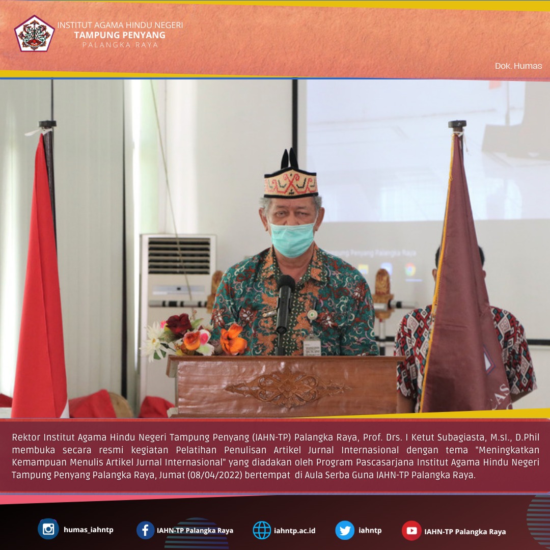 Kegiatan dibuka secara resmi oleh Rektor Institut Agama Hindu Negeri Tampung Penyang (IAHN-TP) Palangka Raya, Prof. Drs. I Ketut Subagiasta, M.Si., D.Phil yang sekaligus memberi sambutan pada kegiatan Pelatihan Penulisan Jurnal Internasional ini.