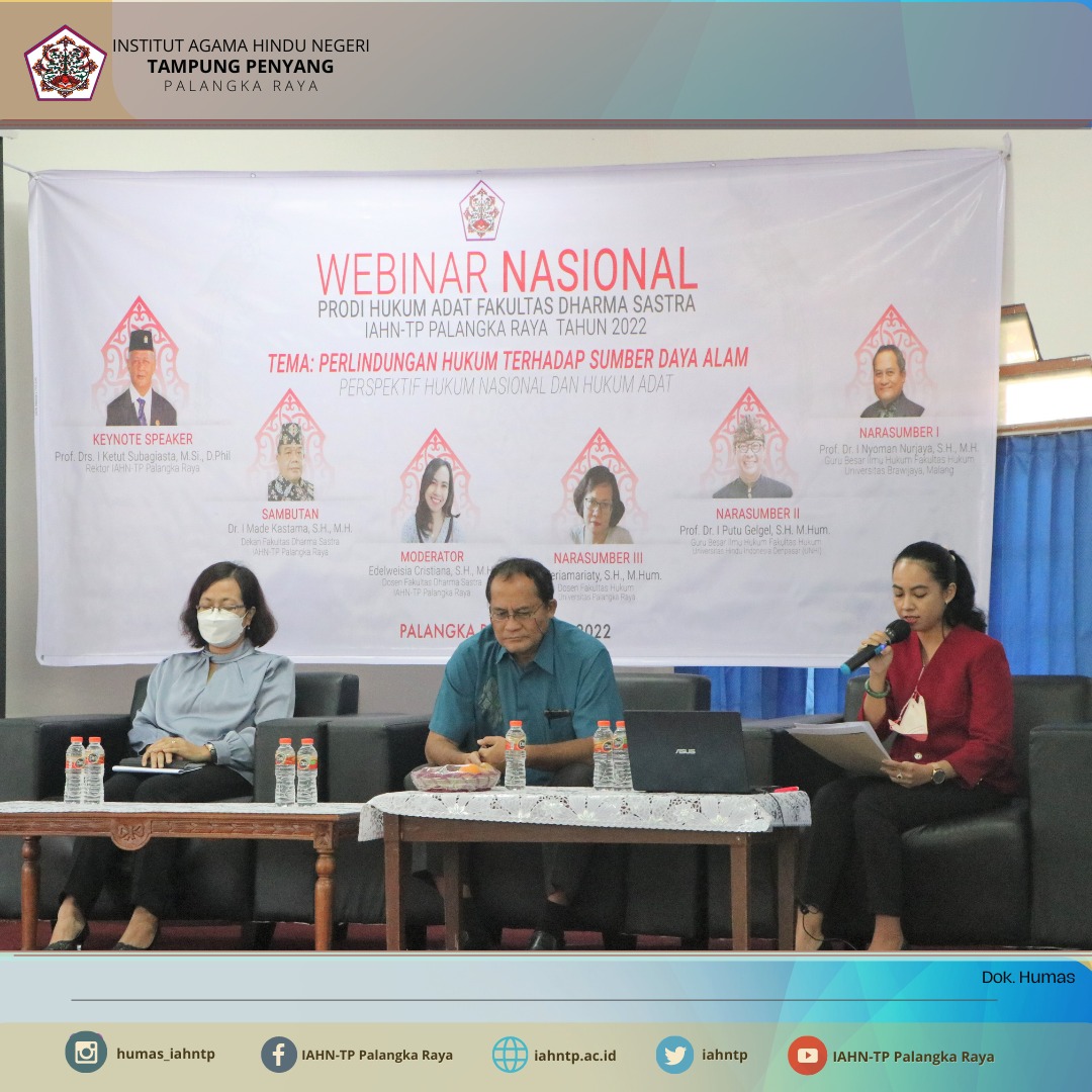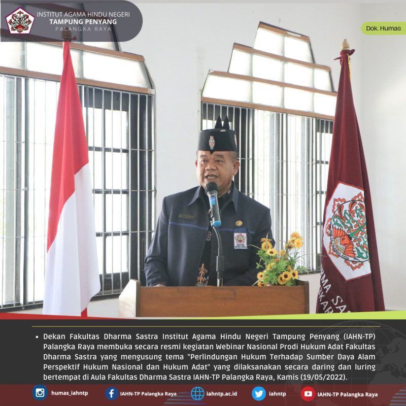IAHNTPnews,- Untuk meningkatkan pengetahuan dan menambah wawasan akademik tentang pentingnya perlindungan hukum terhadap sumber daya alam baik dari perspektif hukum nasional maupun hukum adat, sehingga kedepannya pengelolaan sumber daya alam dapat berjalan sesuai dengan peraturan perundang-undangan yang berlaku yang berlandaskan nilai-nilai kearifan lokal ataupun hukum adat, Program Studi Hukum Adat Fakultas Dharma Sastra Institut Agama Hindu Negeri Tampung Penyang (IAHN-TP) Palangka Raya menggelar Seminar Nasional dengan tema “Perlindungan Hukum Terhadap Sumber Daya Alam Perspektif Hukum Nasional dan Hukum Adat”, Kamis, (19/05/2022).