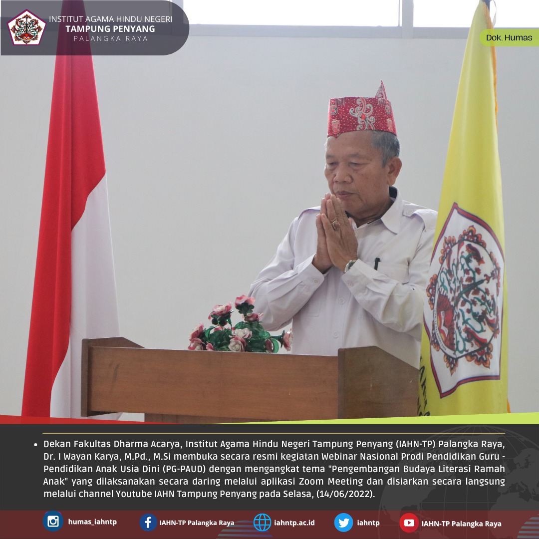 HUMAS IAHNTPnews,- Guna melestarikan literasi di kalangan anak-anak masa kini dan agar dapat memahami pentingnya pengembangan budaya literasi ramah anak, Program Studi Pendidikan Guru – Pendidikan Anak Usia Dini (PG-PAUD), Fakultas Dharma Acarya, Institut Agama Hindu Negeri Tampung Penyang (IAHN-TP) Palangka Raya mengadakan Webinar Nasional dengan tema “Pengembangan Budaya Literasi Ramah Anak”, Selasa (14/06/2022).