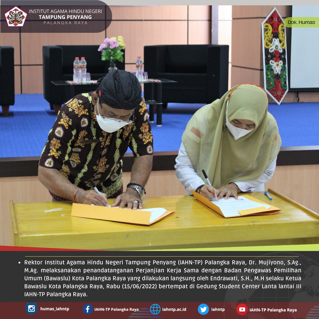 HUMAS IAHNTPnews,- Institut Agama Hindu Negeri Tampung Penyang (IAHN-TP) Palangka Raya melakukan Perjanjian Kerja Sama dengan Badan Pengawas Pemilihan Umum (Bawaslu) Kota Palangka Raya pada Rabu (15/06/2022).