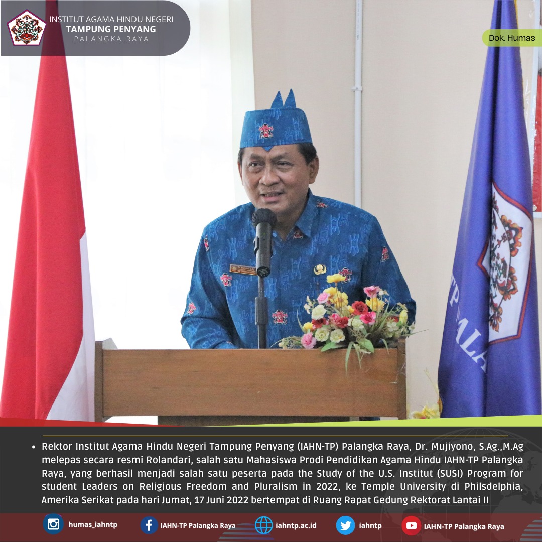 HUMAS IAHNTPnews,- Pelepasan Mahasiswa mengikuti program the Study of the U.S. Institut (SUSI) Program for student Leaders on Religious Freedom and Pluralism in 2022, ke Temple University di Philadelphia Amerika Serikat oleh Rektor Institut Agama Hindu Negeri Tampung Penyang (IAHN-TP) Palangka Raya, Jumat (17/06/2022) bertempat di Ruang Rapat Gedung Rektorat Lantai II IAHN-TP Palangka Raya.