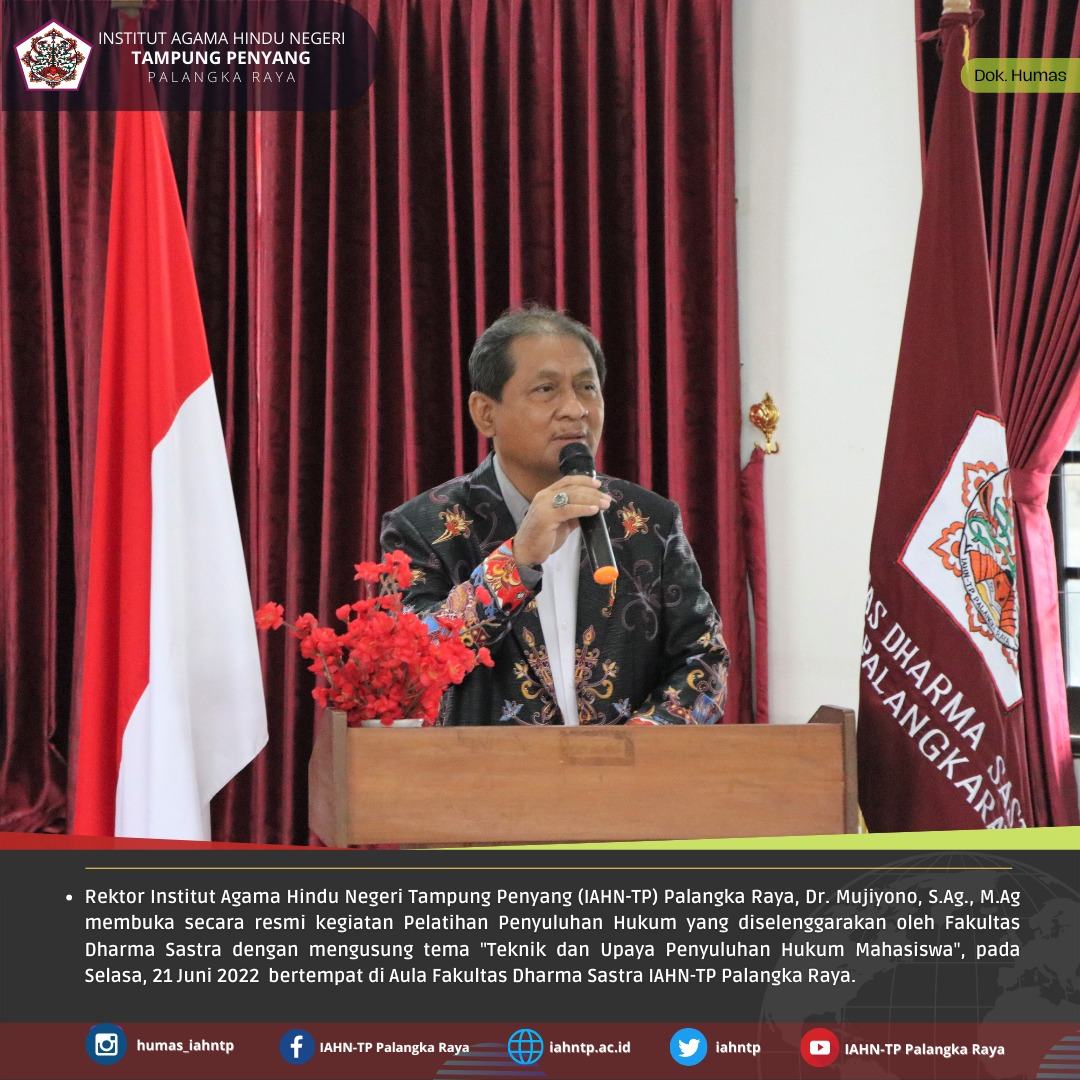 HUMAS IAHNTPnews,- Untuk membekali mahasiswa agar memiliki teknik dan trik serta strategi dalam upaya mengetahui cara menyampaikan penyuluhan hukum yang baik dan benar kepada umat maupun kepada masyarakat, Fakultas Dharma Sastra Institut Agama Hindu Negeri Tampung Penyang (IAHN-TP) Palangka Raya menggelar Pelatihan Penyuluhan Hukum dengan mengusung tema “Teknik dan Upaya Penyuluhan Hukum”, bertempat di Aula Fakultas Dharma Sastra, Selasa (21/06/2022).