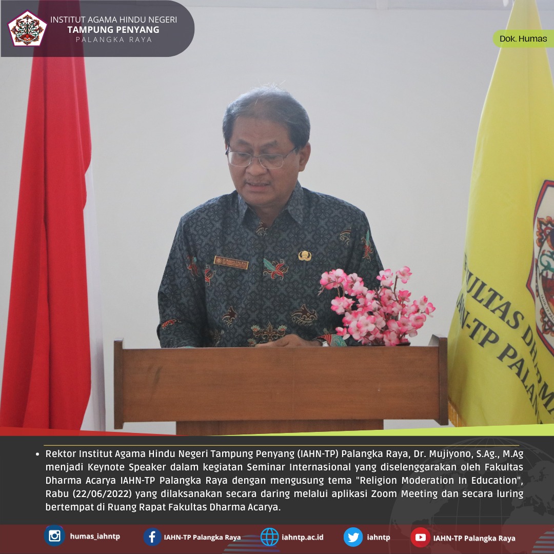 Untuk mendukung dan menggalangkan program penguatan moderasi beragama khususnya melalui bidang pendidikan, Fakultas Dharma Acarya, Institut Agama Hindu Negeri Tampung Penyang (IAHN-TP) Palangka Raya melaksanakan Seminar Internasional dengan mengangkat tema “Religious Moderation In Education” yang dilaksanakan secara daring pada Hari Rabu (22/06/2022)