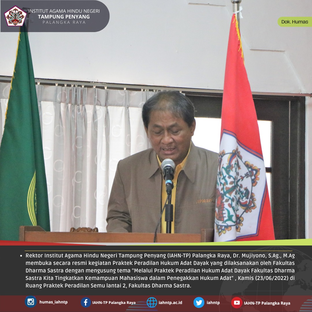 Dalam kesempatan tersebut, Rektor Institut Agama Hindu Negeri Tampung Penyang Palangka Raya, Dr. Mujiyono, S.Ag., M.Ag. mengapresiasi dan berterimakasih kepada seluruh panitia dan pihak yang terlibat atas terselenggaranya kegiatan Praktik Peradilan Hukum Adat Dayak yang penting untuk dilaksanakan ini guna menambah wawasan, keterampilan, dan kemampuan mahasiswa dalam menegakkan hukum adat dan berpesan kepada seluruh peserta dalam hal ini mahasiswa (i) Fakultas Dharma Sastra agar mengikuti praktik ini dengan sebaik-baiknya agar keterampilan ini dapat dipergunakan saat terjun di masyarakat nanti.
