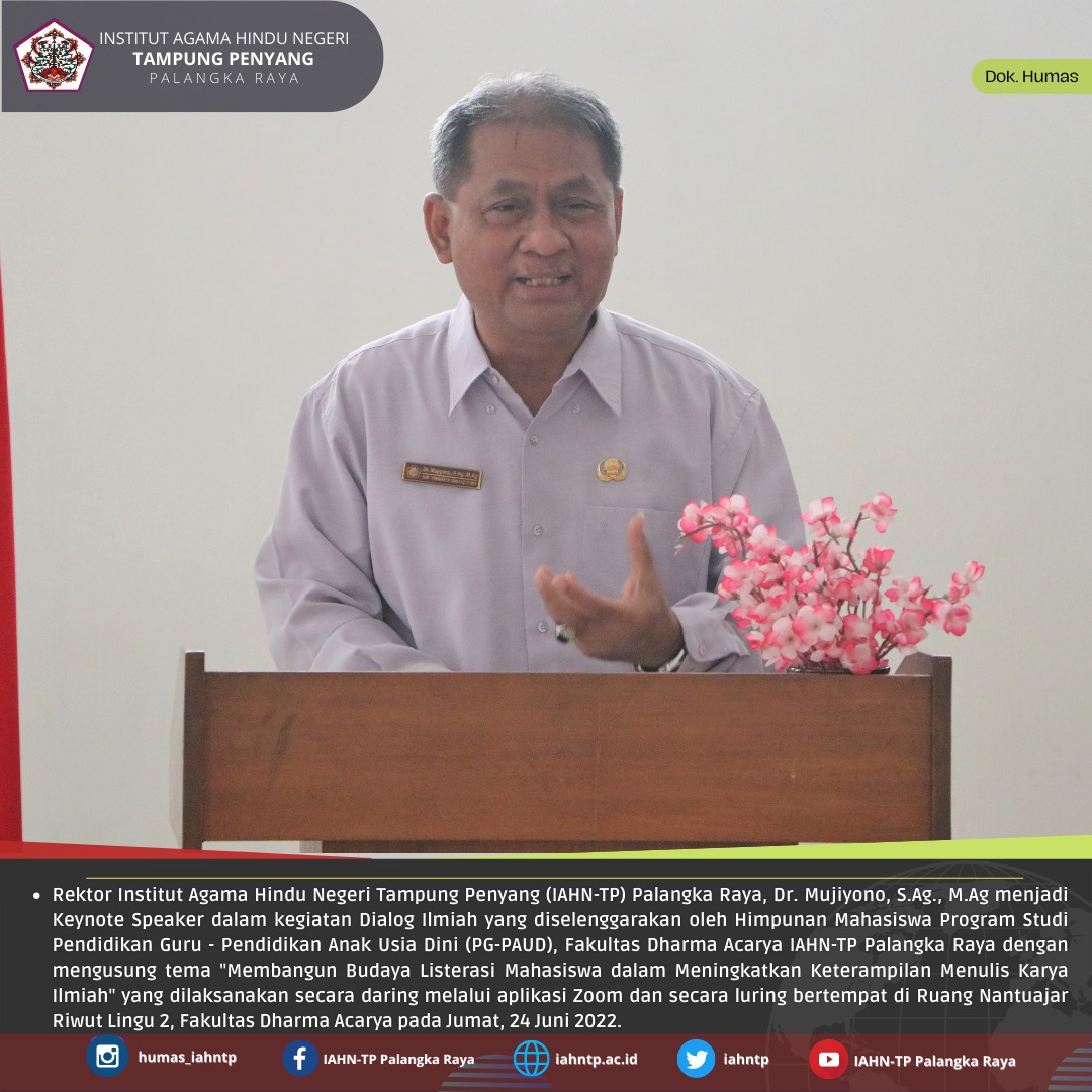 HUMAS IAHNTPnews,- Guna mengembangkan budaya literasi serta meningkatkan kualitas mahasiswa IAHN-TP Palangka Raya dalam penulisan karya ilmiah, Himpunan Mahasiswa Prodi Pendidikan Guru-Pendidikan Anak Usia Dini (PG-PAUD) Institut Agama Hindu Negeri Tampung Penyang (IAHN-TP) Palangka Raya menggelar Dialog Ilmiah Mahasiswa dengan tema “Membangun Budaya Listerasi Mahasiswa dalam Meningkatkan Keterampilan Menulis Karya Ilmiah” secara daring melalui aplikasi Zoom dan luring bertempat di Ruang Nantuajar Riwut Lingu 2, Fakultas Dharma Acarya pada Jumat, 24/06/2022.