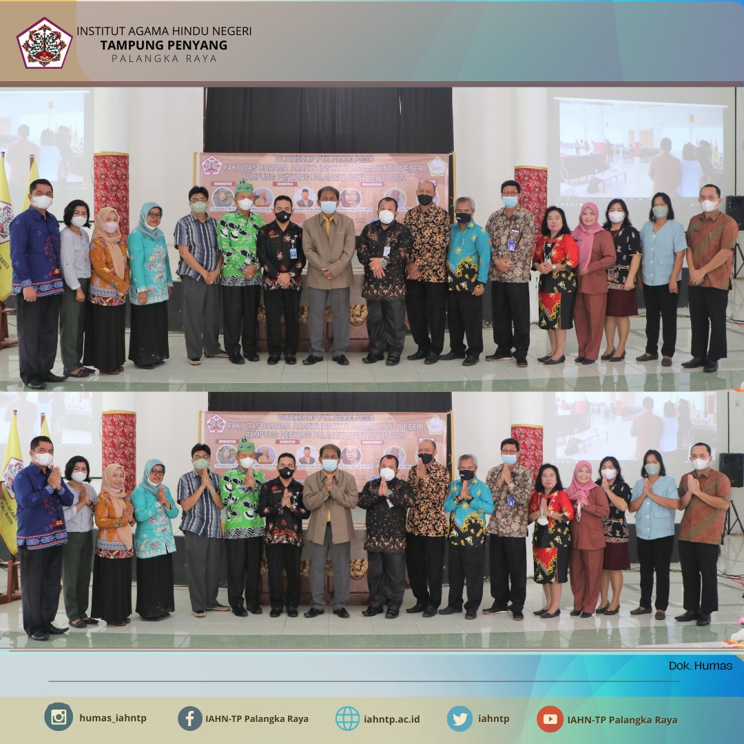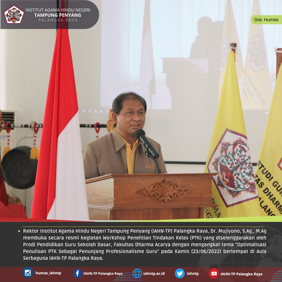 HUMAS IAHNTPnews,- Program Studi Pendidikan Guru Sekolah Dasar (PGSD), Fakultas Dharma Acarya, Institut Agama Hindu Negeri Tampung Penyang (IAHN-TP) Palangka Raya mengadakan Workshop Penelitian Tindakan Kelas (PTK) dengan tema “Optimalisasi Penulisan PTK sebagai Penunjang Profesionalisme Guru” yang dilaksanakan secara daring melalui aplikasi Zoom dan secara luring bertempat di Aula Serbaguna IAHN-TP Palangka Raya pada Kamis, 23 Juni 2022.