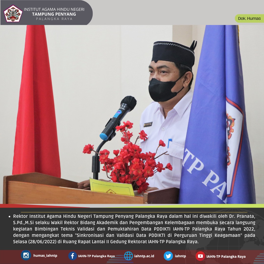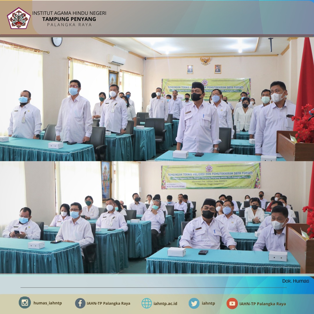 HUMAS IAHNTPnews,- Guna menghasilkan informasi dan pengembangan pengetahuan mengenai cara serta langkah-langkah dalam melakukan proses pemutakhiran data dan penyinkronan data dalam pangkalan data, Institut Agama Hindu Negeri Tampung Penyang (IAHN-TP) Palangka Raya melaksanakan kegiatan Bimbingan Teknis Validasi dan Pemuktahiran Data PDDIKTI IAHN-TP Palangka Raya Tahun 2022, dengan mengangkat tema “Sinkronisasi dan Validasi Data PDDIKTI di Perguruan Tinggi Keagamaan”, Selasa (28/06/2022) di Ruang Rapat Lantai 2 Gedung Rektorat IAHN-TP Palangka Raya.