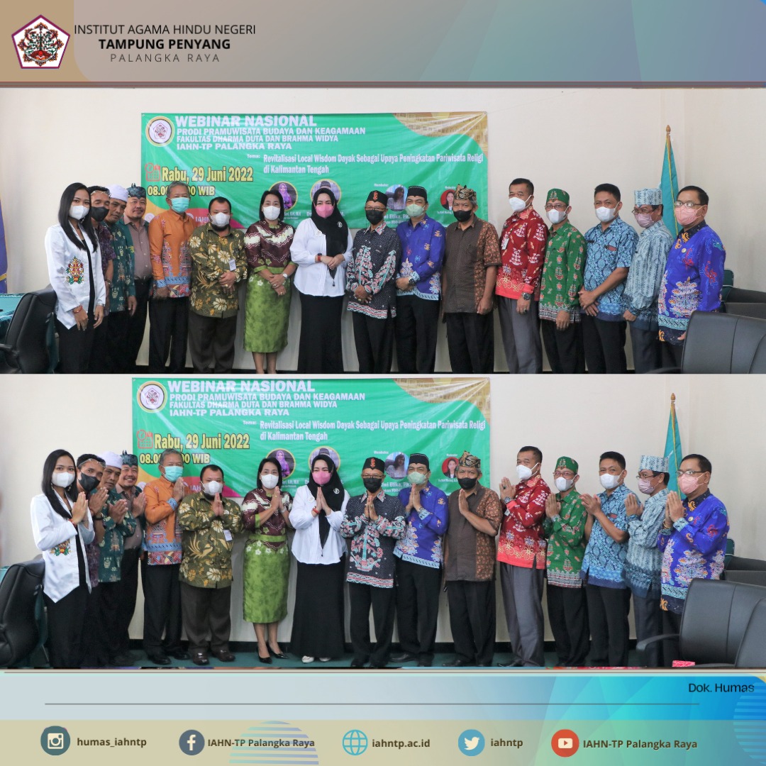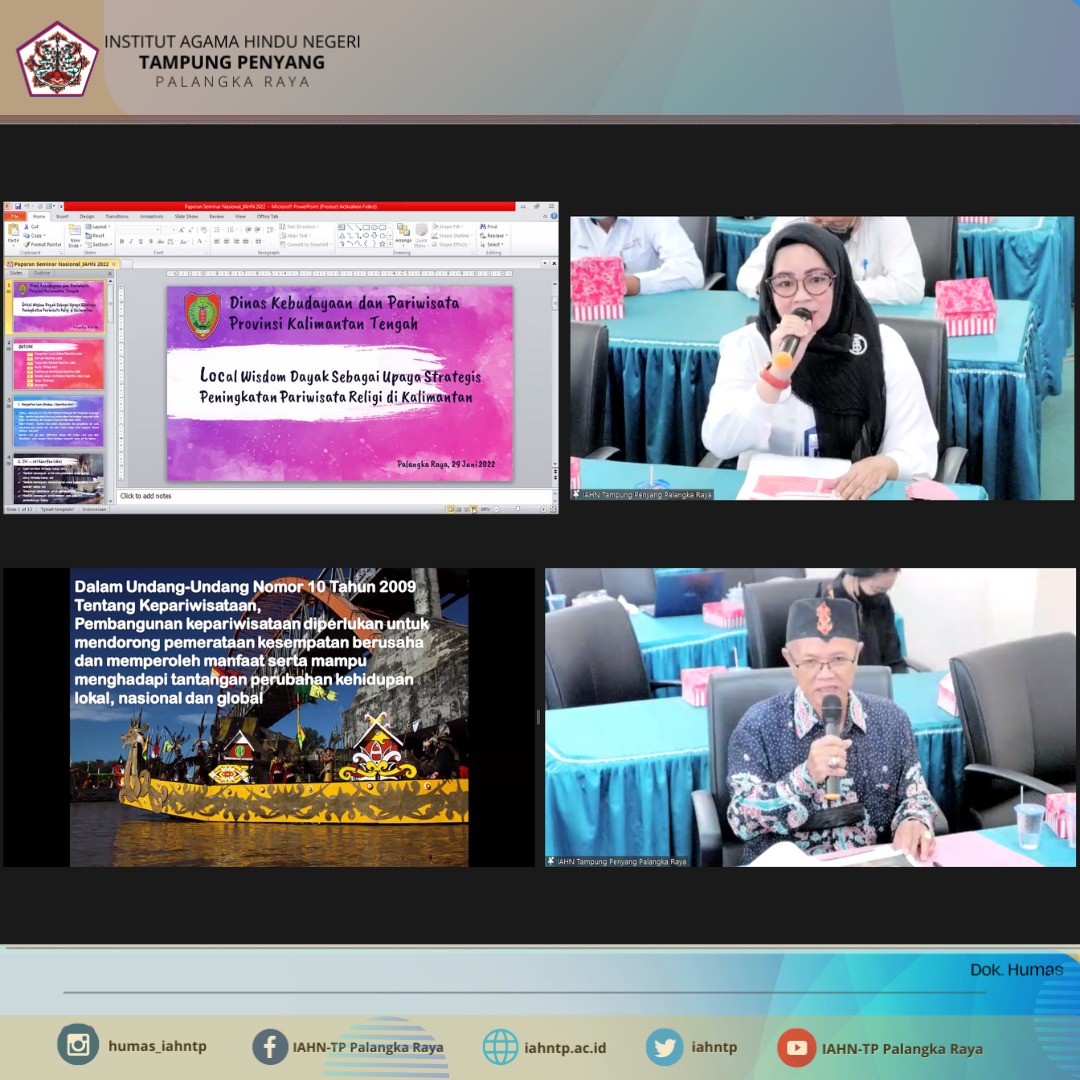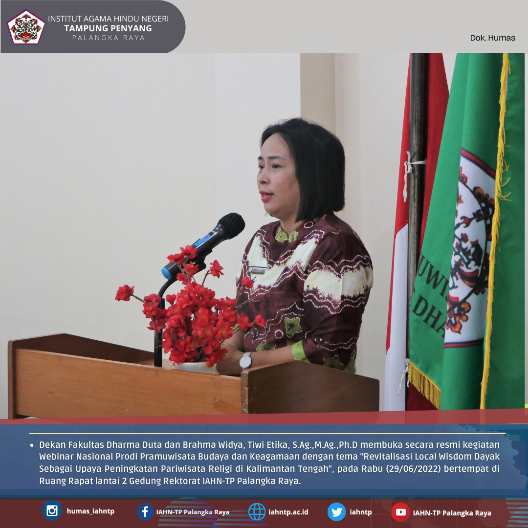 HUMAS IAHNTPnews,- Prodi Pramuwisata Budaya dan Keagamaan, Fakultas Dharma Duta dan Brahma Widya, Institut Agama Hindu Negeri Tampung Penyang (IAHN-TP) Palangka Raya menggelar kegiatan Webinar Nasional dengan memgusung tema “Revitalisasi Local Wisdom Dayak Sebagai Upaya Peningkatan Pariwisata Religi di Kalimantan Tengah”, pada Hari Rabu, 29 Juni 2022.