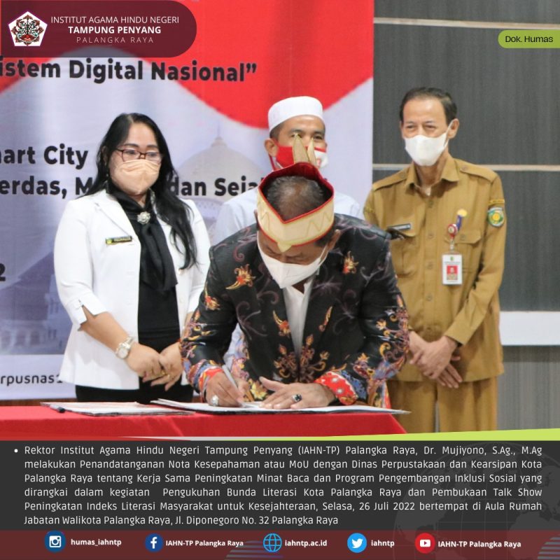 HUMAS IAHNTPnews,- Rektor Institut Agama Hindu Negeri Tampung Penyang (IAHN-TP) Palangka Raya, Dr. Mujiyono, S.Ag., M.Ag melakukan Penandatanganan Nota Kesepahaman (MoU) dengan Dinas Perpustakaan dan Kearsipan Kota Palangka Raya tentang Peningkatan Minat Baca dan Program Pengembangan Inklusi Sosial yang dirangkai dalam kegiatan Pengukuhan Bunda Literasi Kota Palangka Raya dan Pembukaan Talk Show Peningkatan Indeks Literasi...Read More