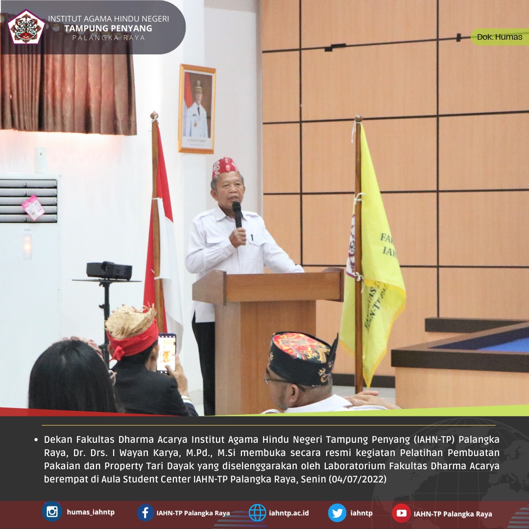 HUMAS IAHNTPnews,- Laboratorium Fakultas Dharma Acarya, Institut Agama Hindu Negeri Tampung Penyang Palangka Raya mengadakan Pelatihan Pembuatan Pakaian dan Property Tari Dayak pada Senin (04/07/2022) bertempat di Aula Student Center IAHN-TP Palangka Raya. Kegiatan dihadiri dan dibuka secara resmi oleh Dekan Fakultas Dharma Acarya, Dr. Drs. I Wayan Karya, M.Pd., M.Si.