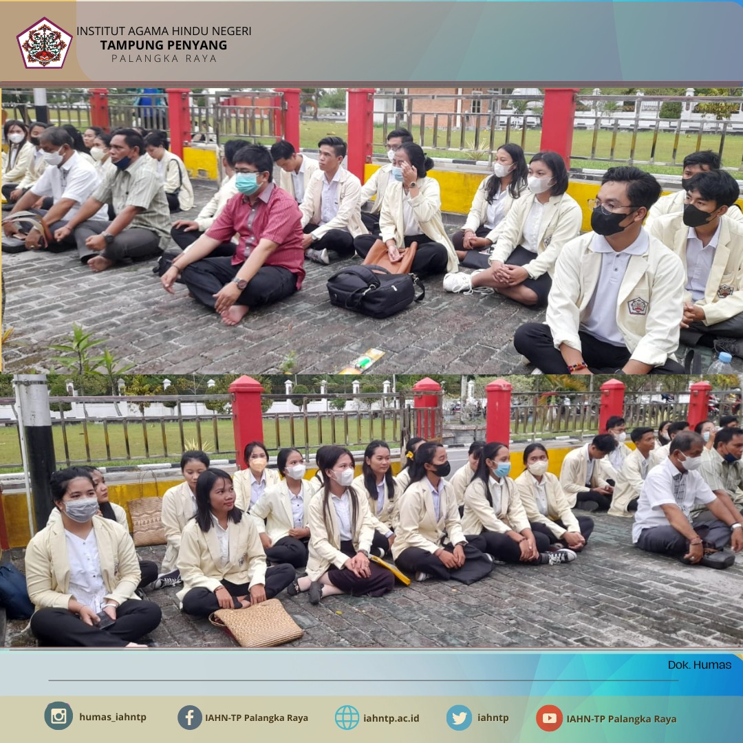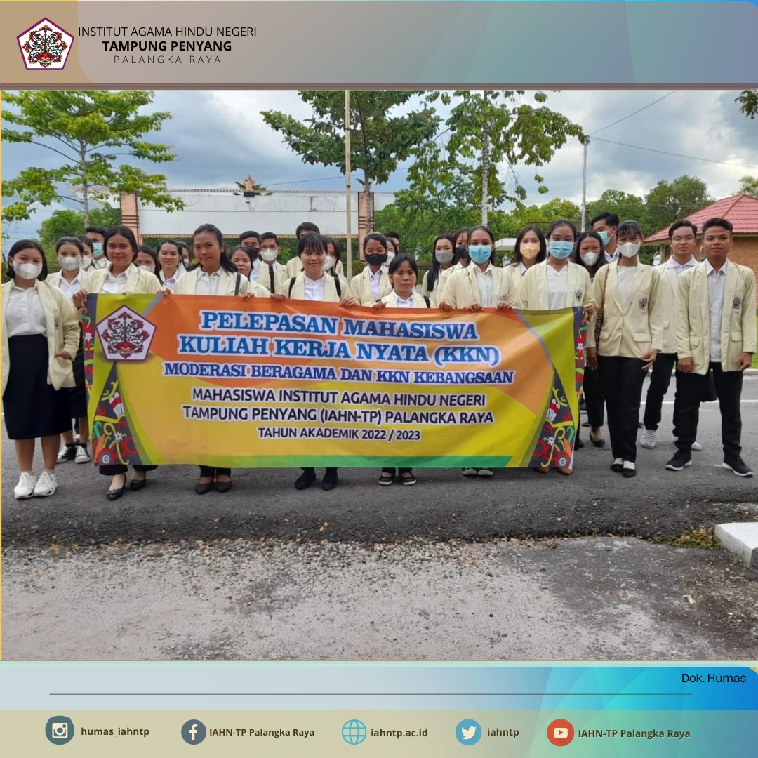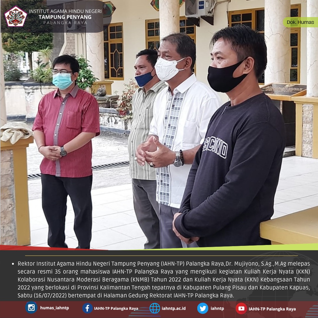 HUMAS IAHNTPnews,- Rektor Institut Agama Hindu Negeri Tampung Penyang (IAHN-TP) Palangka Raya, Dr. Mujiyono, S.Ag., M.Ag didampingi oleh Wakil Rektor Bidang Kemahasiswaan dan Kerja Sama, Ketua dan Sekretaris LPPM serta Pengelola melepas secara resmi 35 orang mahasiswa IAHN-TP Palangka Raya yang mengikuti kegiatan Kuliah Kerja Nyata (KKN) Kolaborasi Nusantara Moderasi Beragama (KNMB) Tahun 2022 dan Kuliah Kerja Nyata (KKN) Kebangsaan Tahun 2022 yang berlokasi di Provinsi Kalimantan Tengah tepatnya di Kabupaten Pulang Pisau dan Kabupaten Kapuas, Sabtu (16/07/2022) bertempat di Halaman Gedung Rektorat IAHN-TP Palangka Raya.