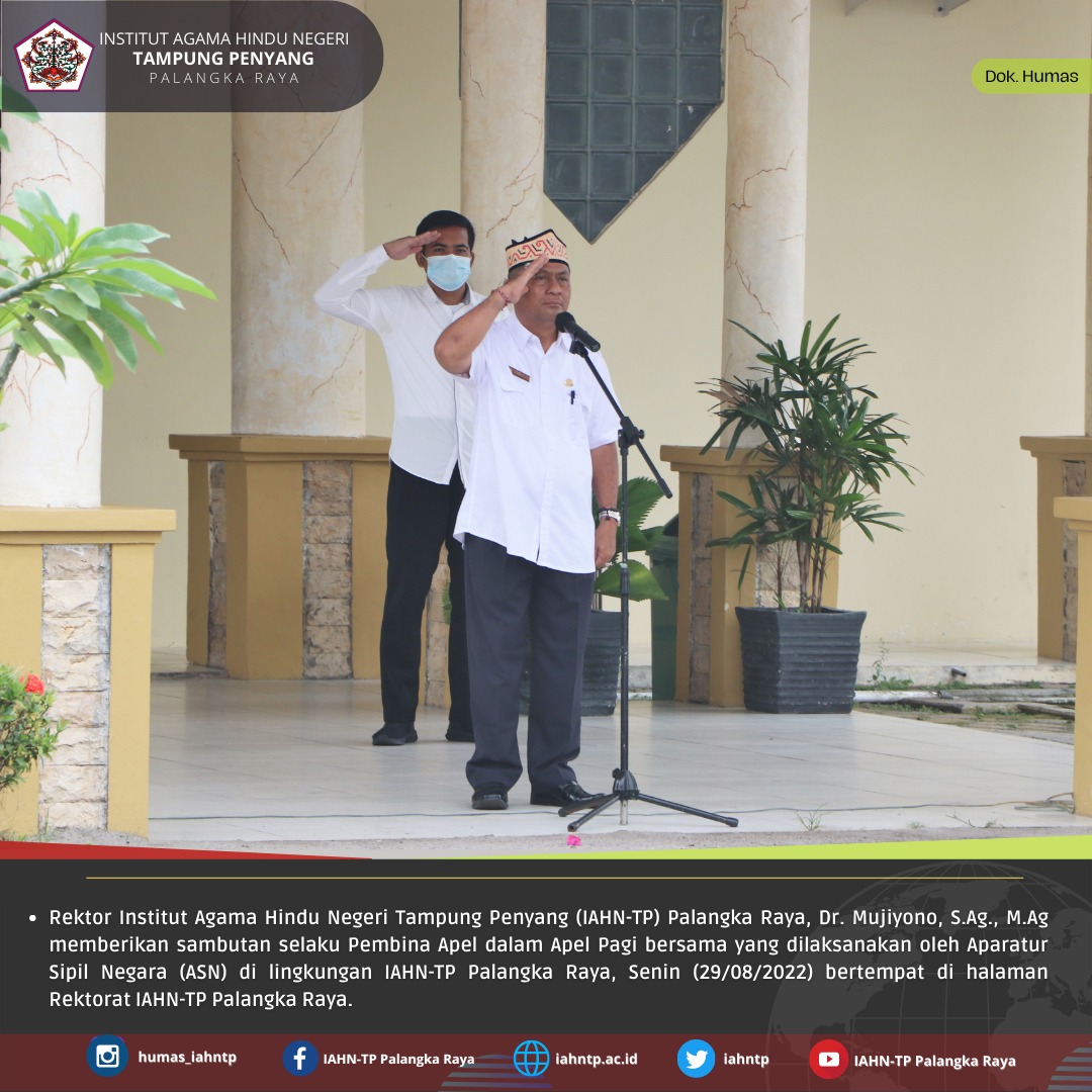 HUMAS IAHNTPnews,- Senin (29/08/2022. Pelaksanaan Apel Pagi bersama dilingkungan IAHN-TP Palangka Raya diikuti oleh seluruh ASN IAHN-TP Palangka Raya dengan Rektor IAHN-TP Palangka Raya sebagai Pembina dalam Apel tersebut. Apel dilaksanakan bertempat di halaman Rektorat IAHN-TP Palangka Raya.