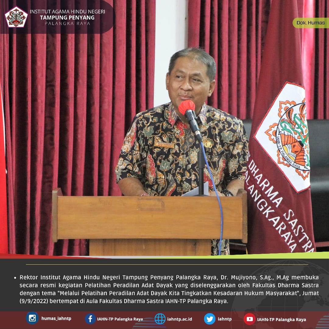 HUMAS IAHNTPnews,- Untuk memberikan pemahaman dan pengetahuan secara akademik kepada mahasiswa tentang peradilan adat dan hukum adat, Fakultas Dharma Sastra Institut Agama Hindu Negeri Tampung Penyang (IAHN-TP) Palangka Raya menggelar kegiatan Pelatihan Peradilan Adat Dayak dengan mengusung tema “Melalui Pelatihan Peradilan Adat Dayak Kita Tingkatkan Kesadaran Hukum Masyarakat”, Jumat (9/9/2022).