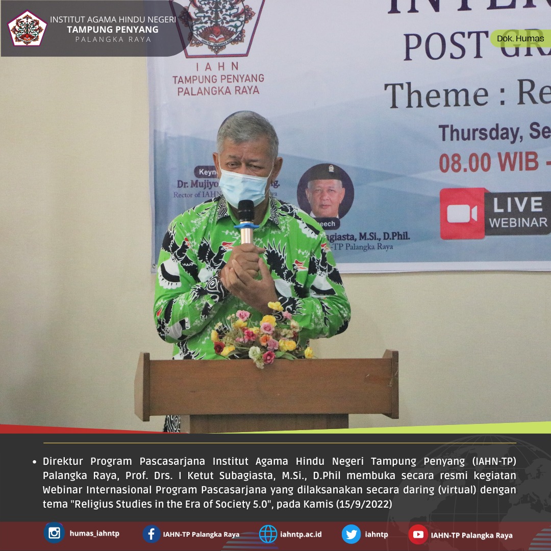 HUMAS IAHNTPNEWS,- Program Pascasarjana Institut Agama Hindu Negeri Tampung Penyang (IAHN-TP) Palangka Raya menyelenggarakan Webinar Internasional dengan tema “Religious Studies in the Era of Society 5.0” yang diselenggarakan secara daring (virtual) melalui Zoom Meeting pada hari Kamis (15/9/2022).