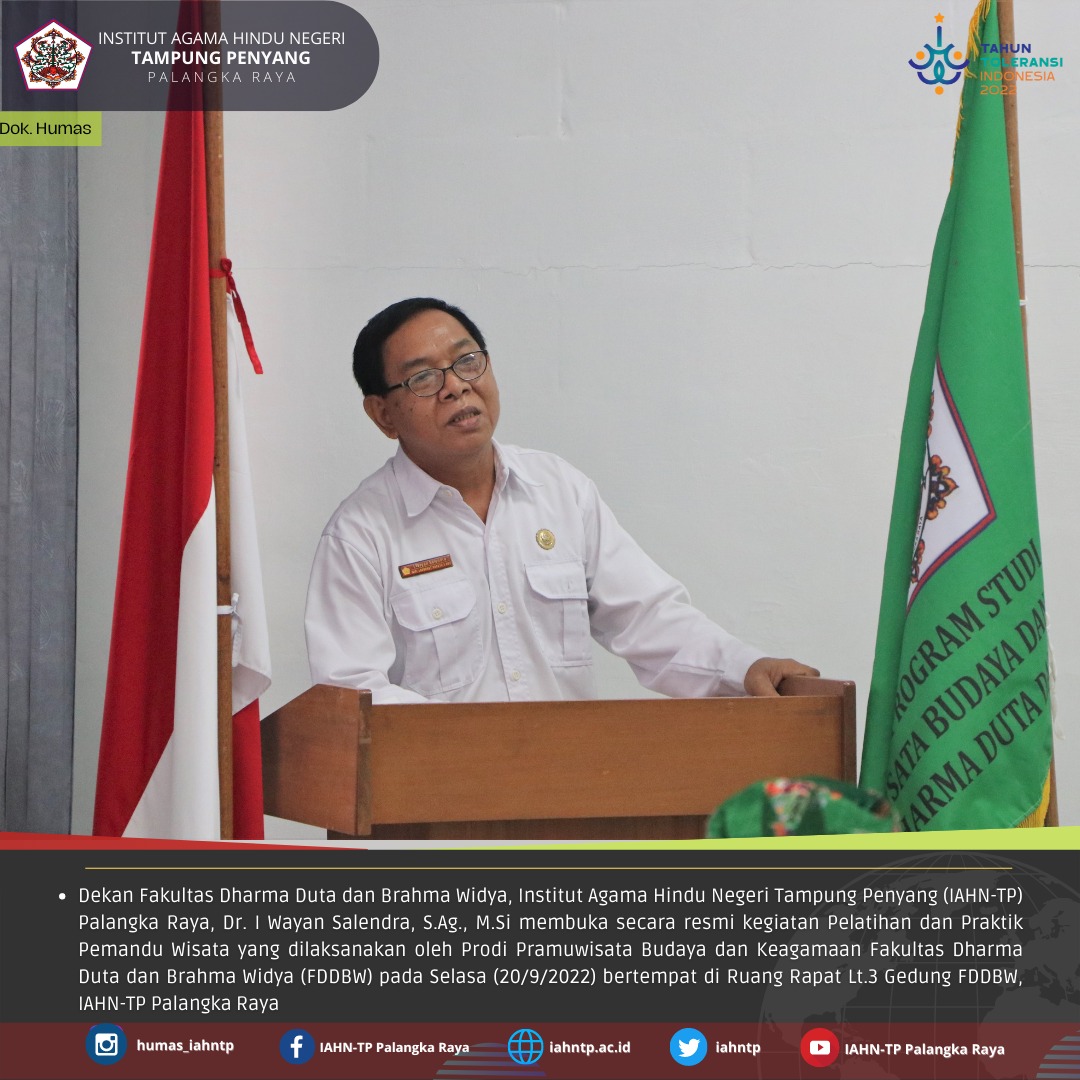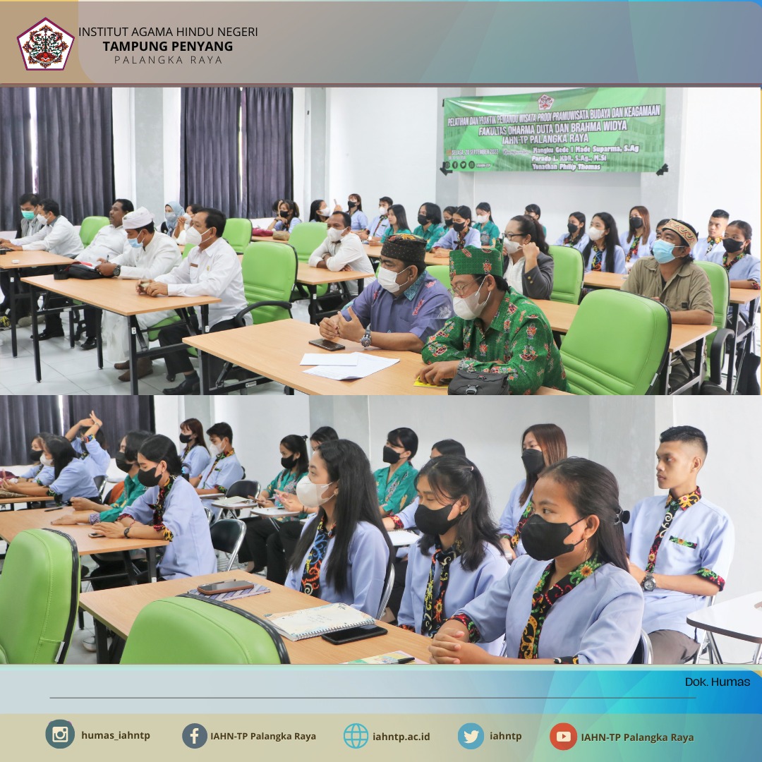 Humas IAHNTPnews,- Prodi Pramuwisata Budaya dan Keagamaan Fakultas Dharma Duta dan Brahma Widya (FDDBW), Institut Agama Hindu Negeri Tampung Penyang (IAHN-TP) Palangka Raya mengadakan kegiatan Pelatihan dan Praktik Pemandu Wisata bertempat di Ruang Rapat Lt.3 Gedung FDDBW, IAHN-TP Palangka Raya pada Hari Selasa (20/09/2022)
