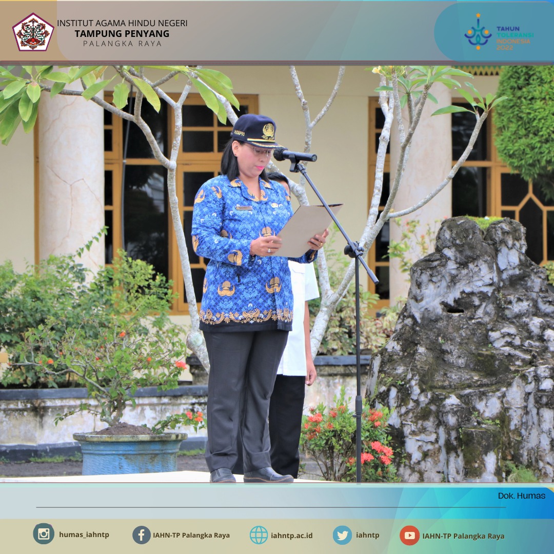 Bertugas sebagai Inspektur Upacara Wakil Rektor Bidang Akademik dan Pengembangan Kelembagaan IAHN-TP Palangka Raya, Tiwi Etika, S.Ag., M.Ag., Ph.D yang dalam amanatnya membacakan Sambutan dari Rektor IAHN-TP Palangka Raya.