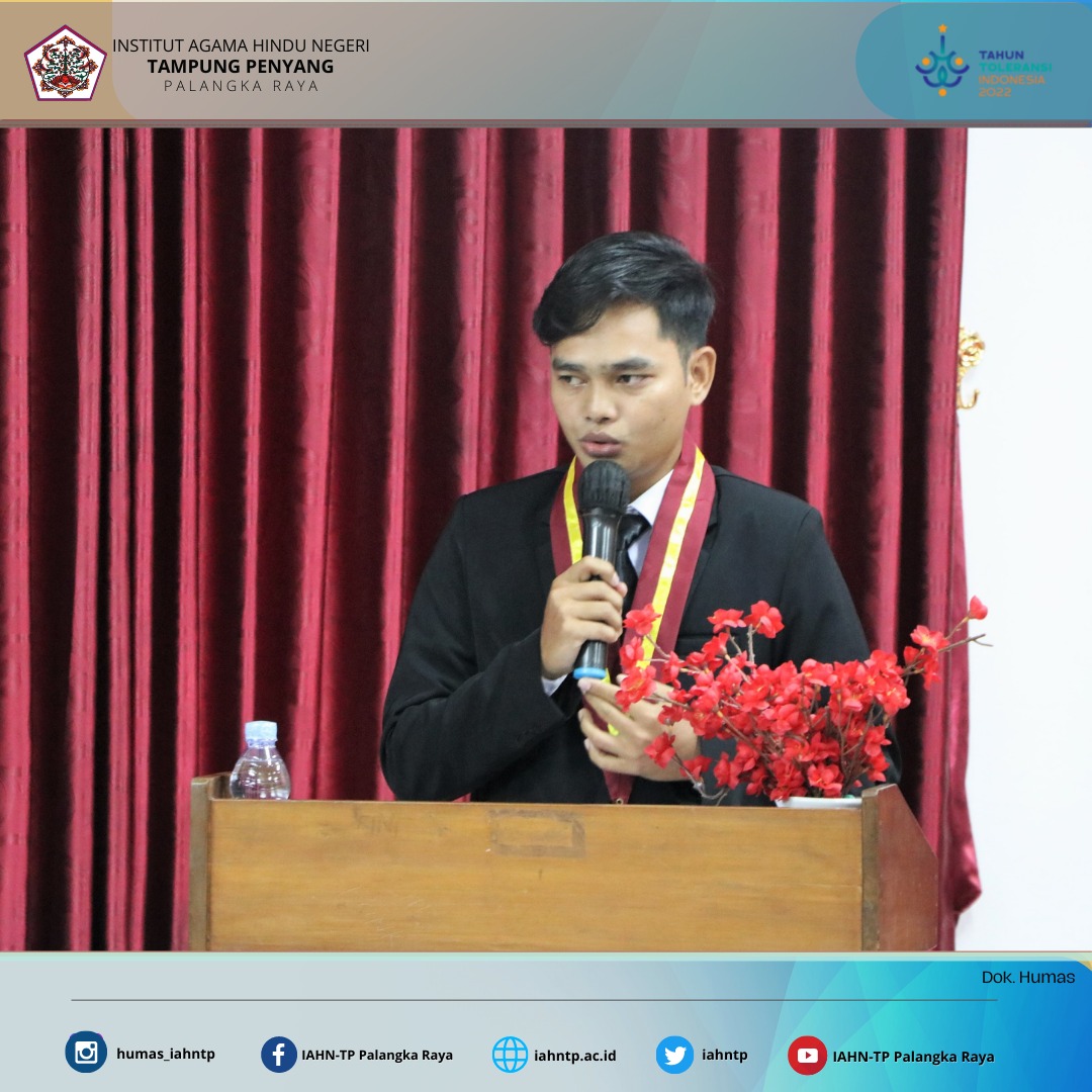 Ajing Susilo perwakilan mahasiswa saat menyampaikan kesan dan pesannya mengungkapkan rasa terimakasihnya kepada dosen dan tenaga kependidikan yang selama ini telah membimbing dan membantu dalam lancarnya pembelajaran dan pelayanan selama menempuh pendidikan di kampus IAHN-TP Palangka Raya dan mengajak kepada seluruh rekannya untuk dapat menggunakan segala ilmu yang telah diperoleh dengan kreatif sebagai bekal di dalam ketatnya persaingan dunia kerja.