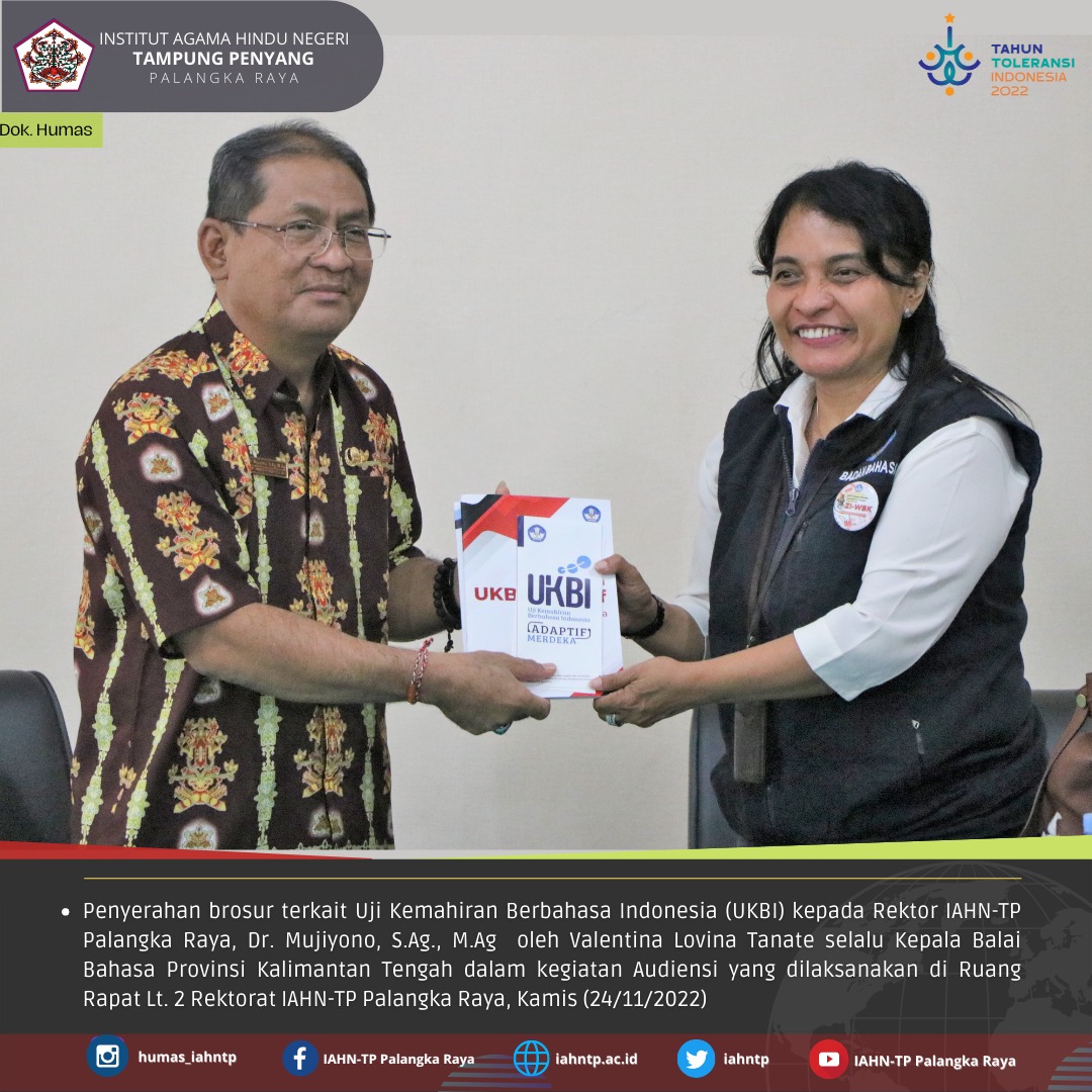 Valentina Lovina Tanate, S.Pd., M.Hum selalu Kepala Balai Bahasa Provinsi Kalimantan Tengah mengatakan Audiensi ini dilaksanakan terkait dengan Uji Kemahiran Berbahasa Indonesia (UKBI) sebagai salah satu wujud tindakan nyata dari Nota Kesepahaman yang telah terjalin antara IAHN-TP Palangka Raya dengan Balai Bahasa Kalimantan Tengah.