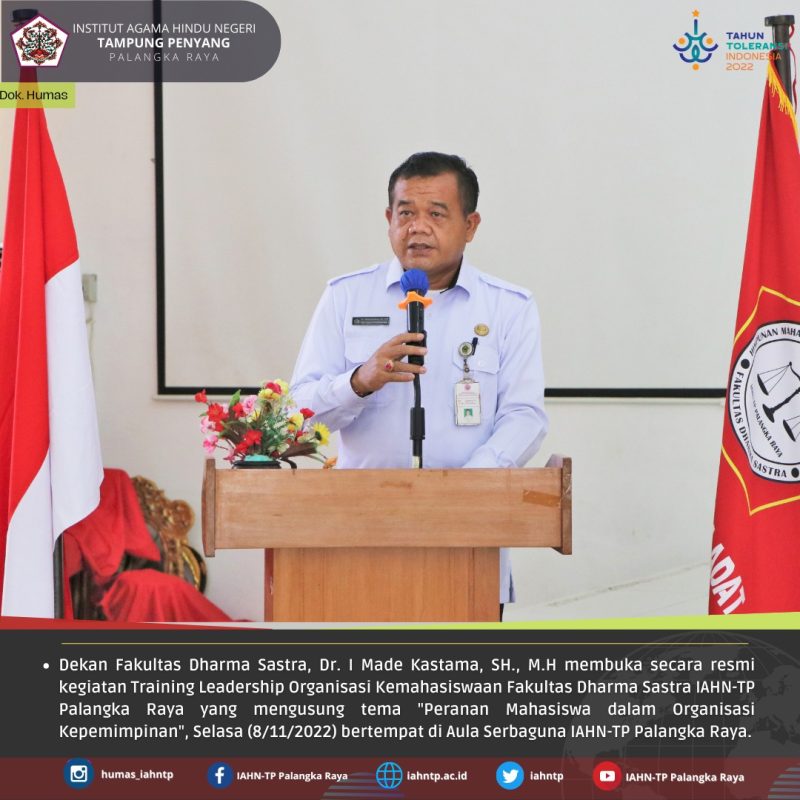 HUMAS IAHNTPnews,- Himpunan Mahasiswa Fakultas Dharma Sastra Institut Agama Hindu Negeri Tampung Penyang (IAHN-TP) Palangka Raya melaksanakan Training Leadership Organisasi Kemahasiswaan Fakultas Dharma Sastra dengan tema “Peranan Mahasiswa dalam Organisasi Kepemimpinan”, Selasa (8/11/2022) bertempat di Aula Serbaguna IAHN-TP Palangka Raya. Dekan Fakultas Dharma Sastra, Dr. I Made Kastama, SH., M.H dalam sambutannya saat membuka kegiatan,...Read More