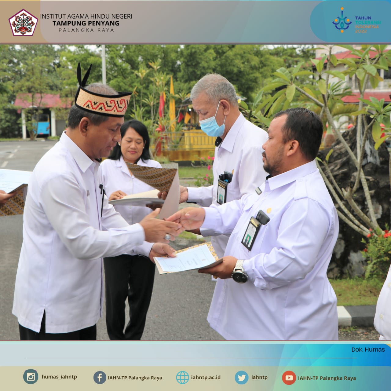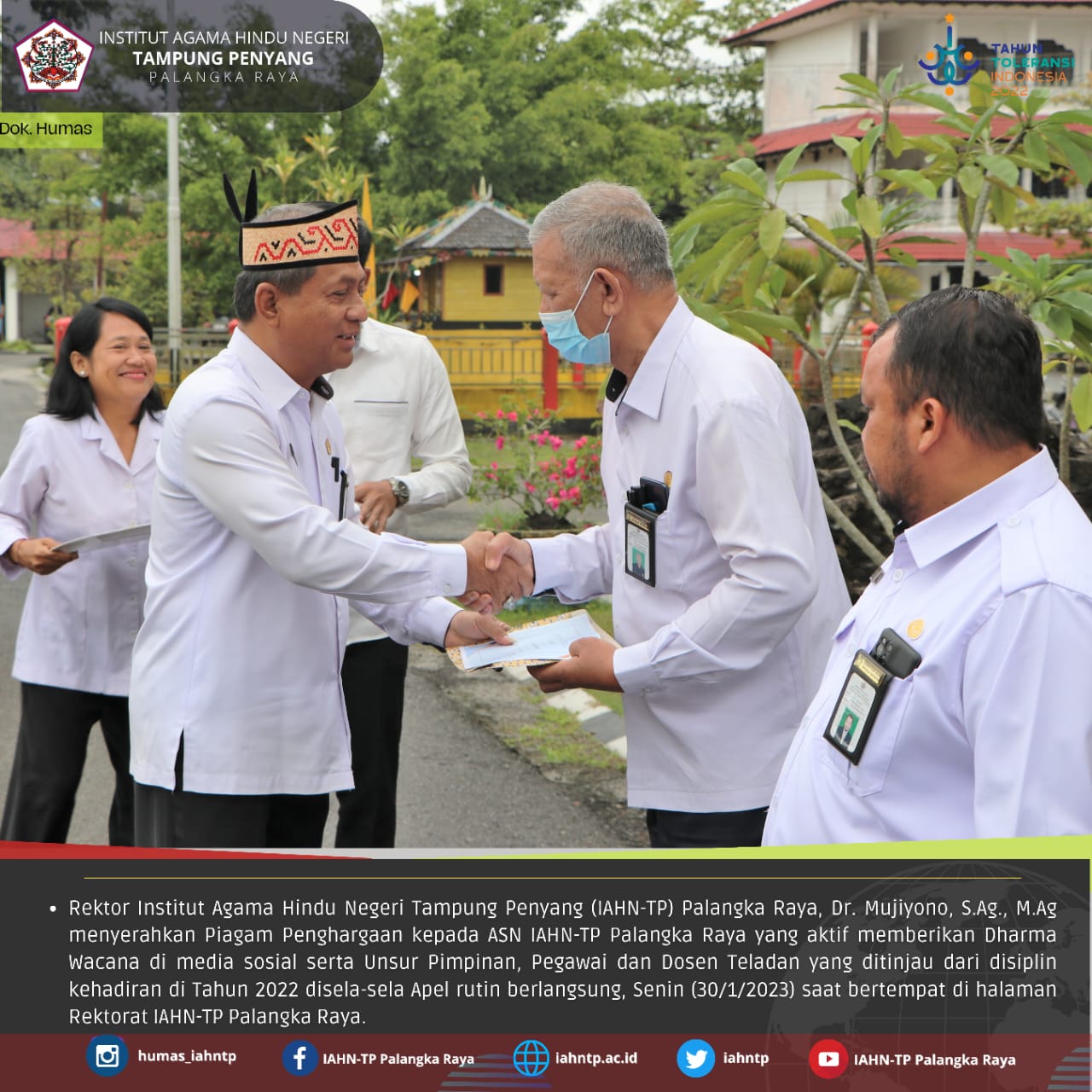 Dalam kegiatan Apel rutin ini dilaksanakan penyerahan Piagam Penghargaan kepada Dosen aktif memberikan dharma wacana di media sosial serta kepada Pimpinan, Pegawai dan Dosen teladan yang ditinjau dari disiplin kehadiran di Tahun 2022 oleh Rektor IAHN-TP Palangka Raya.