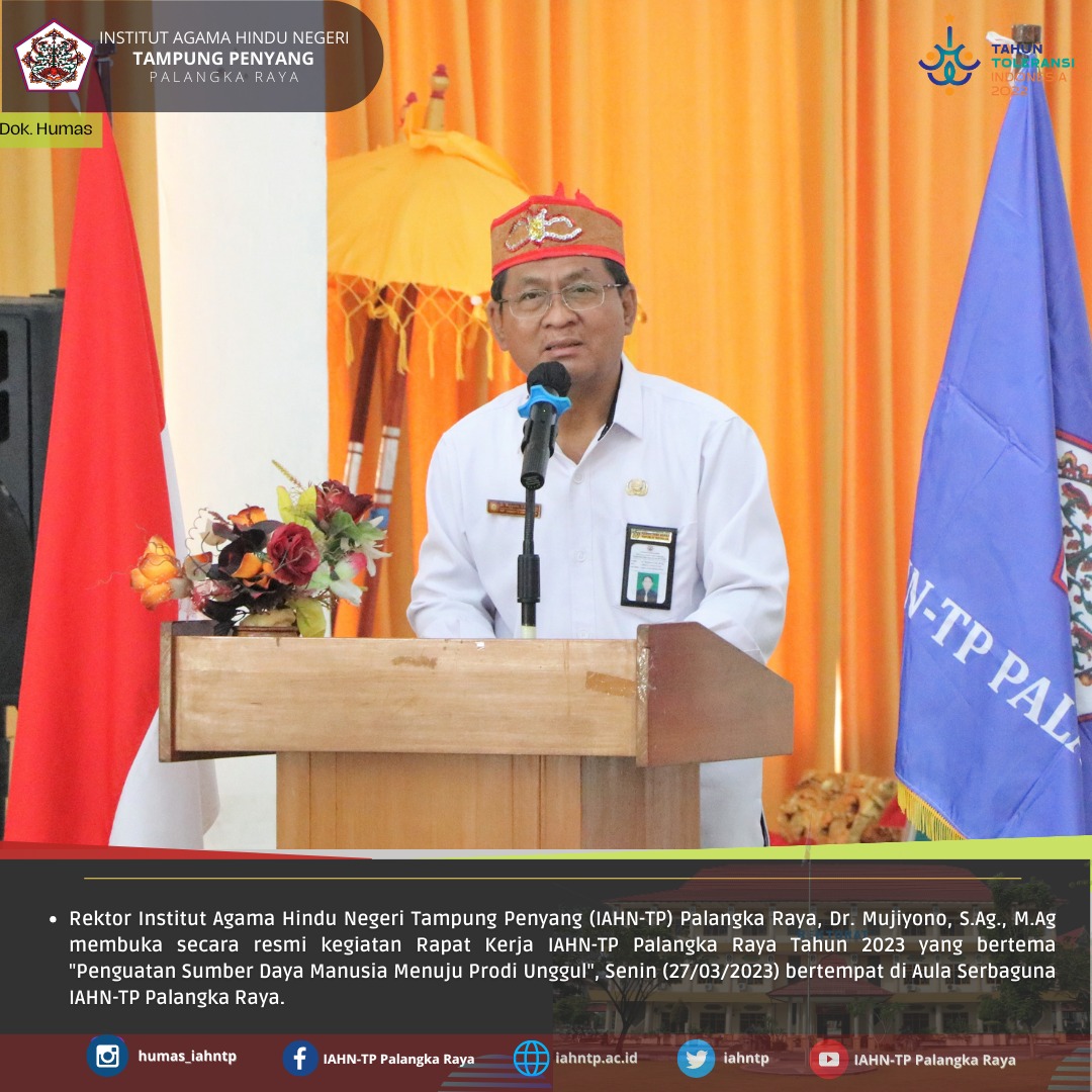 IAHN TPnews,- Institut Agama Hindu Negeri Tampung Penyang (IAHN-TP) Palangka Raya melaksanakan Rapat Kerja Tahun 2023 dengan mengusung tema “Penguatan Sumber Daya Manusia Menuju Prodi Unggul”. Raker dibuka secara resmi oleh Rektor IAHN-TP Palangka Raya, Dr. Mujiyono, S.Ag., M.Ag. bertempat di Aula Serbaguna IAHN-TP Palangka Raya, Senin (27/03/2023).