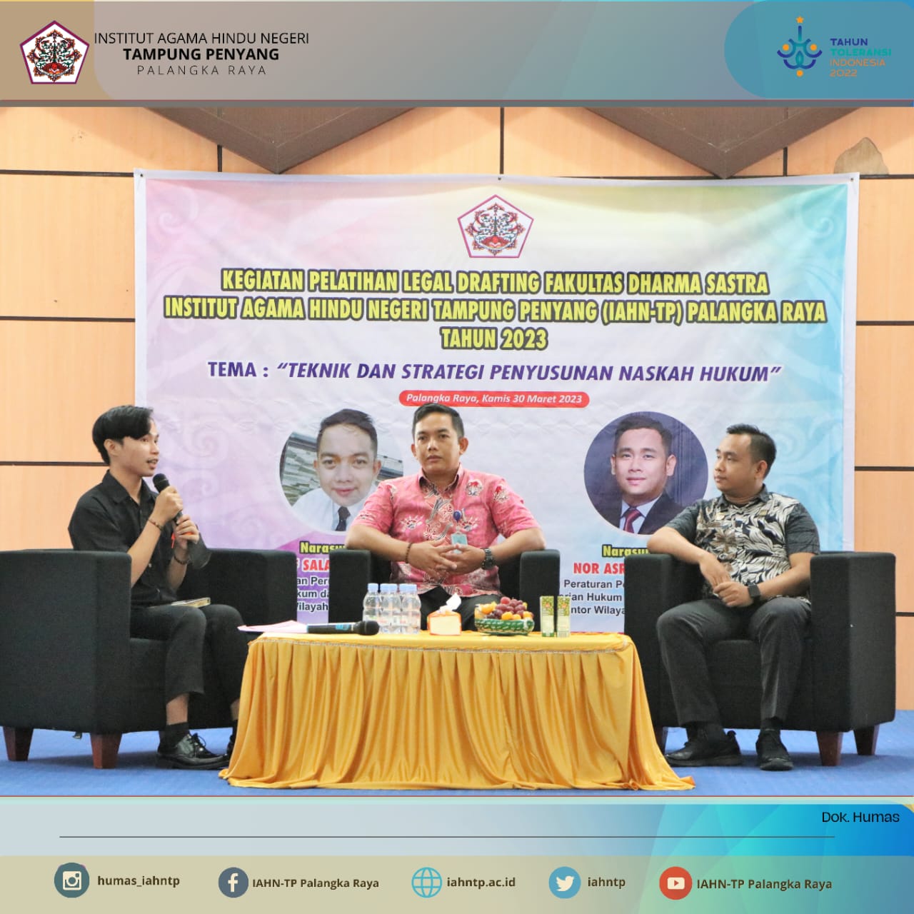 IAHN TPnews,- Fakultas Dharma Sastra Institut Agama Hindu Negeri Tampung Penyang (IAHN-TP) Palangka Raya mengadakan kegiatan Pelatihan Legal Drafting Tahun 2023, Kamis (30/03/2023) bertempat di Aula Gedung Student Center Lt. III IAHN-TP Palangka Raya.