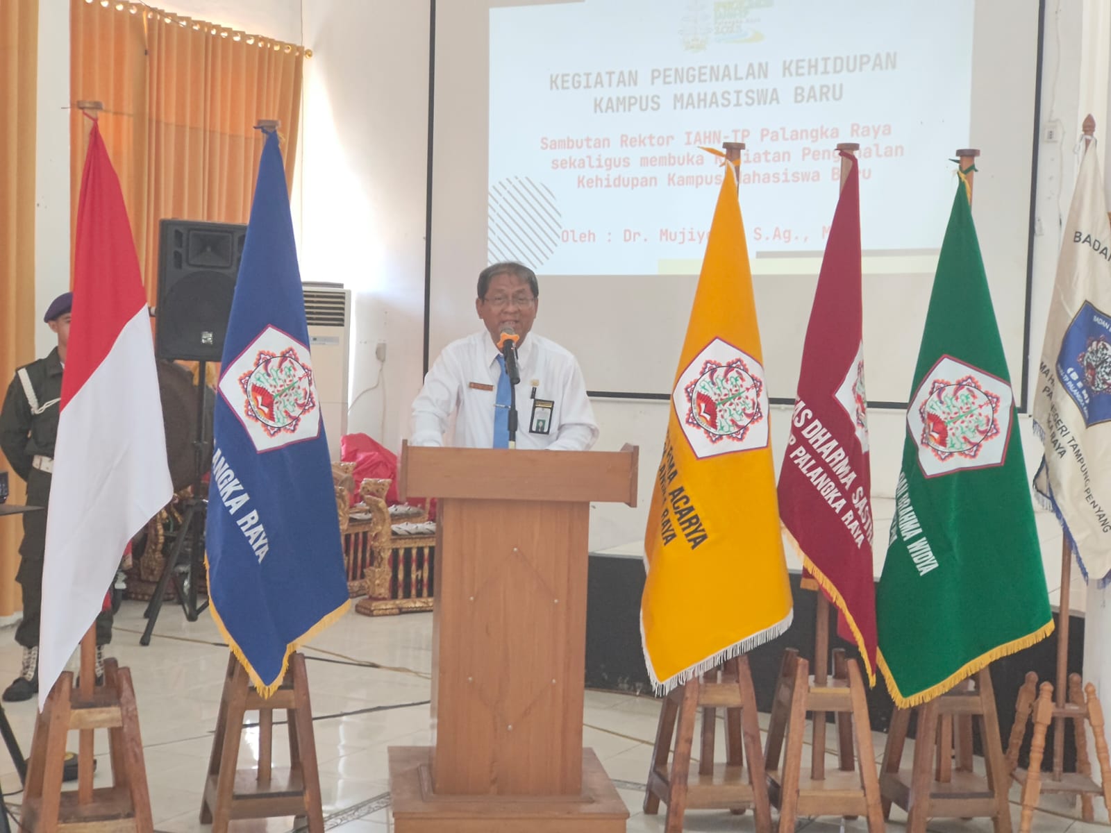 Dalam sambutannya Rektor mengucapkan selamat datang kepada Mahasiswa Baru IAHN TP dan berpesan agar Belajar dengan baik. //a.s//