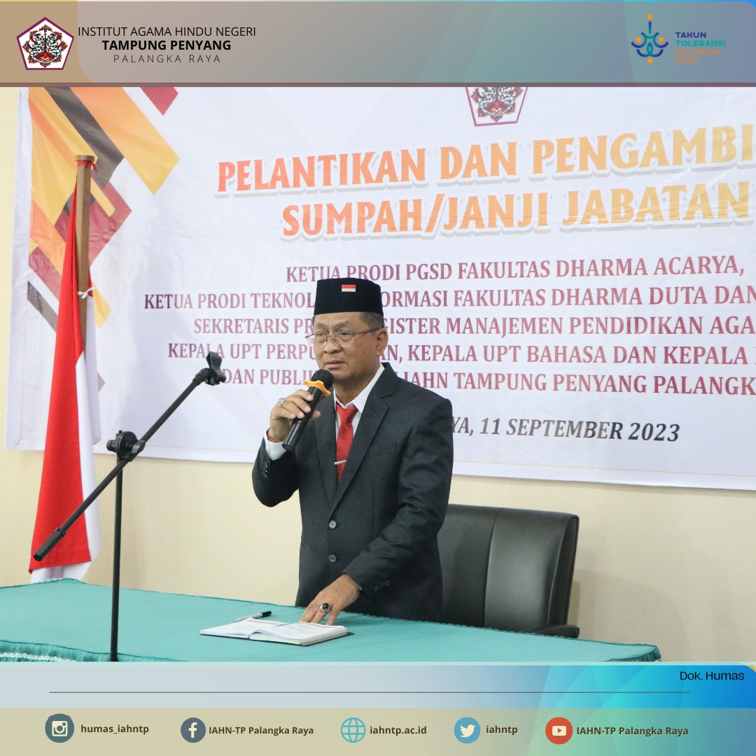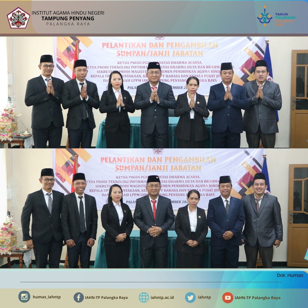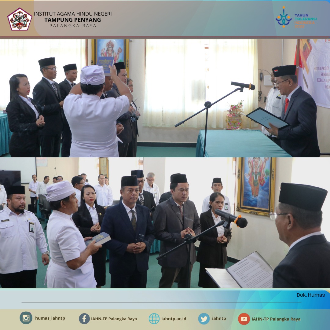 Acara diawali dengan menyanyikan lagu Indonesia Raya yang dilanjutkan dengan pembacaan Surat Keputusan (SK) Rektor IAHN-TP Palangka Raya tentang Pengangkatan Pejabat di Lingkungan Institut Agama Hindu Negeri Tampung Penyang Palangka Raya dan prosesi Pelantikan dan Pengambilan Sumpah / Janji Jabatan yang dilakukan oleh Rektor IAHN-TP Palangka Raya dan didampingi oleh Para Saksi dan Rohaniawan serta dilanjutkan dengan penandatanganan Berita Acara dan Pakta Integritas.