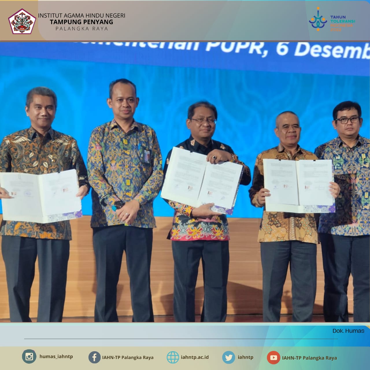 IAHNTPnews,- Menindaklanjuti terbitnya Surat Keputusan Menteri PUPR Nomor 695/KPTS/M/2023 tentang Penerima Bantuan Pembangunan Rumah Susun serta Penerima Bantuan Pembangunan Rumah Susun Khusus pada Perguruan Tinggi dan Lembaga Pendidikan Keagamaan Berasrama Tahun Anggaran 2023 dan berdasarkan Peraturan Menteri PUPR Nomor 7 Tahun 2022 tentang Pelaksanaan bantuan Pembangunan Perumahan dan Penyediaan Rumah Khusus Pasal 31 bahwa perlunya menyusun Nota Kesepakatan (bagi penerima bantuan yang merupakan pemerintah daerah) atau Perjanjian Kerja Sama (bagi penerima bantuan selain pemerintah daerah) sebagai dasar pelaksanaan penyelenggaraan bantuan pembangunan rumah susun tahun anggaran 2023 – 2024 Rektor Institut Agama Hindu Negeri Tampung Penyang Palangka Raya Dr. Mujiyono, S.Ag.,M.Ag didampingi oleh Wakil Rektor Bidang Administrasi Umum Perencanaan dan Keuangan Mitro, S.Pd.,M.Si menghadiri kegiatan Penandatanganan Nota Kesepakatan atau Perjanjian Kerja Sama tentang Penyelenggaraan Bantuan Pembangunan Rumah Susun bertempat di Auditorium Utama Kementerian PUPR Jalan Pattimura Nomor 20, Kebayoran lama, Jakarta Selatan, Rabu 06/12/2023.