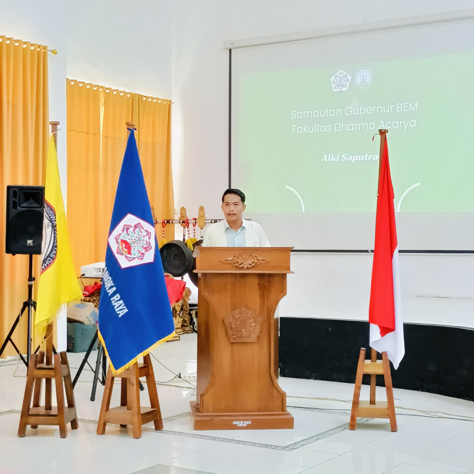 Gubernur BEM Fakultas Dharma Acarya Alki Saputra memberikan laporan terkait pelaksanaan kegiatan ini. Alki menyampaikan bahwa kegiatan ini upaya untuk meningkatkan mahasiswa yang mampu memiliki kepemimpinan dan public speaking yang baik.