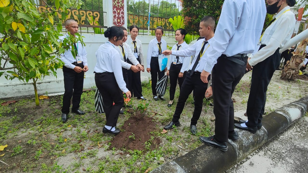 IAHNTPnews,- Peserta Pengenalan Kehidupan Kampus Mahasiswa Baru (PKKMB) di Institut Agama Hindu Negeri Tampung Penyang (IAHN-TP) Palangka Raya melaksanakan kegiatan bakti sosial (baksos) dengan melakukan penanaman pohon hias di lingkungan kampus pada Kamis sore (22/08/2024). Kegiatan ini merupakan bagian dari rangkaian agenda yang telah dijadwalkan oleh panitia PKKMB sebagai penutup acara sebelum dilaksanakannya penutupan resmi.