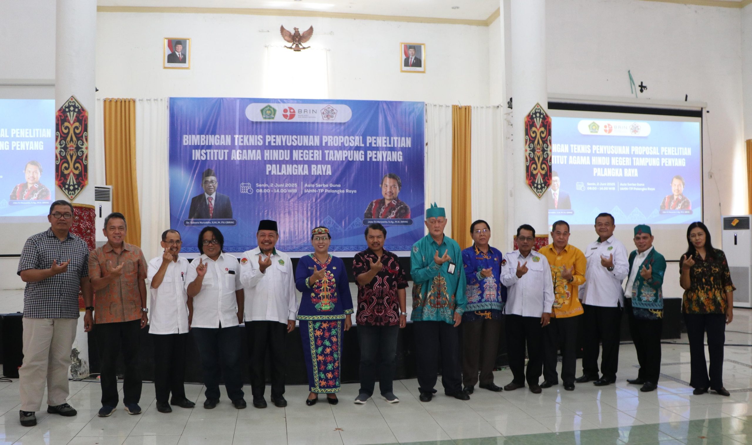 IAHNPnews,- Institut Agama Hindu Negeri Tampung Penyang (IAHN-TP) Palangka Raya menggelar kegiatan Bimbingan Teknis (Bimtek) Penyusunan Proposal Penelitian yang diikuti oleh sebanyak 90 dosen. Kegiatan ini menghadirkan narasumber dari Badan Riset dan Inovasi Nasional (BRIN), yakni Dr. Sabara Nuruddin, S.HI., M.Fil.I., dan Joko Tri Haryanto, S.Ag., M.Si. Kegiatan bertempat di Aula Serbaguna. Senin (02/06).