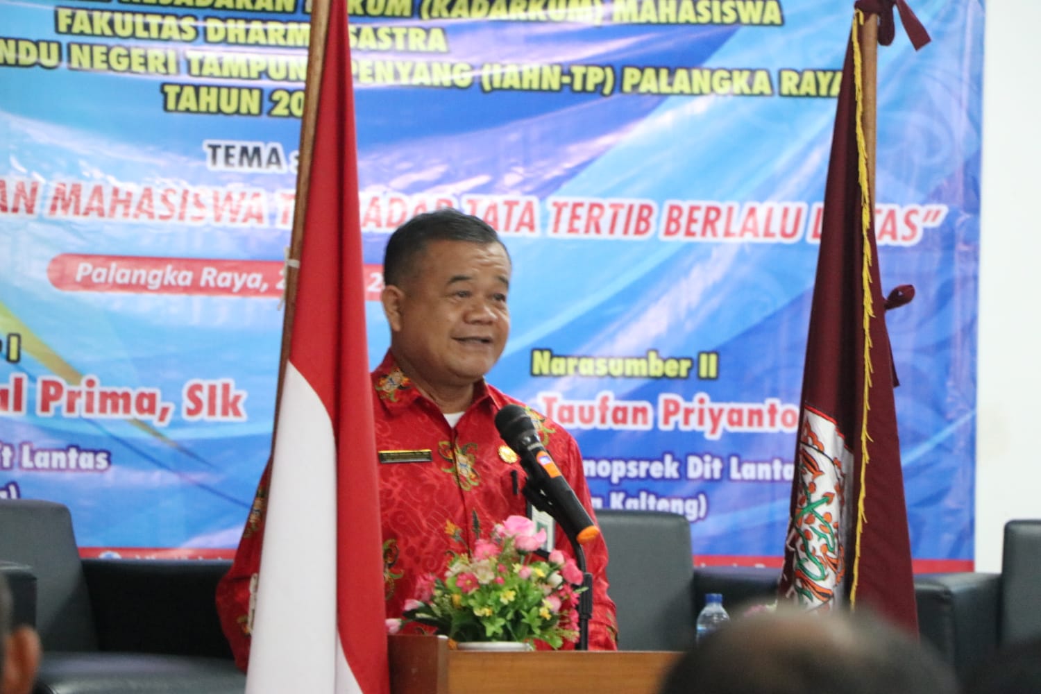 Kegiatan ini dibuka secara resmi oleh Rektor IAHN-TP Palangka Raya, Dr. Mujiyono, S.Ag., M.Ag, yang dalam sambutannya menyampaikan apresiasi terhadap pelaksanaan sarasehan Kadarkum ini. Ia menegaskan bahwa kesadaran hukum, khususnya dalam berlalu lintas, adalah kebutuhan mendasar setiap individu untuk menjaga keamanan diri dan menghormati sesama pengguna jalan.